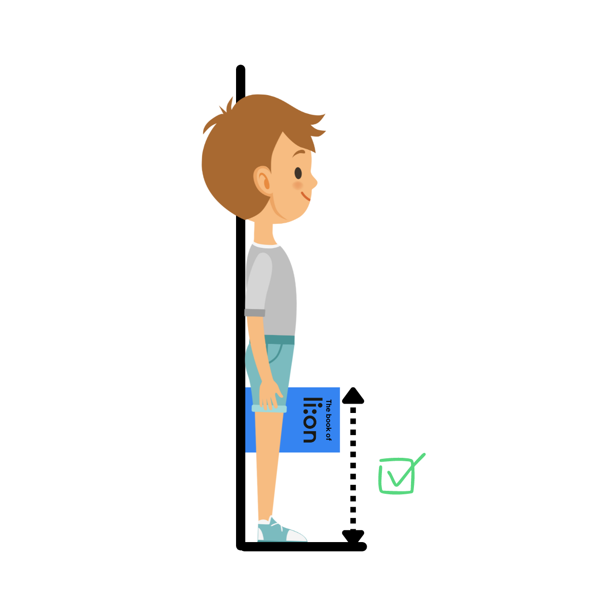 Platziere das Buch zwischen den Beinen deines Kindes, so hoch wie möglich am Schritt, dort wird später der Sattel sein. Achte darauf, dass der Rücken des Buches parallel zur Wand ausgerichtet ist.